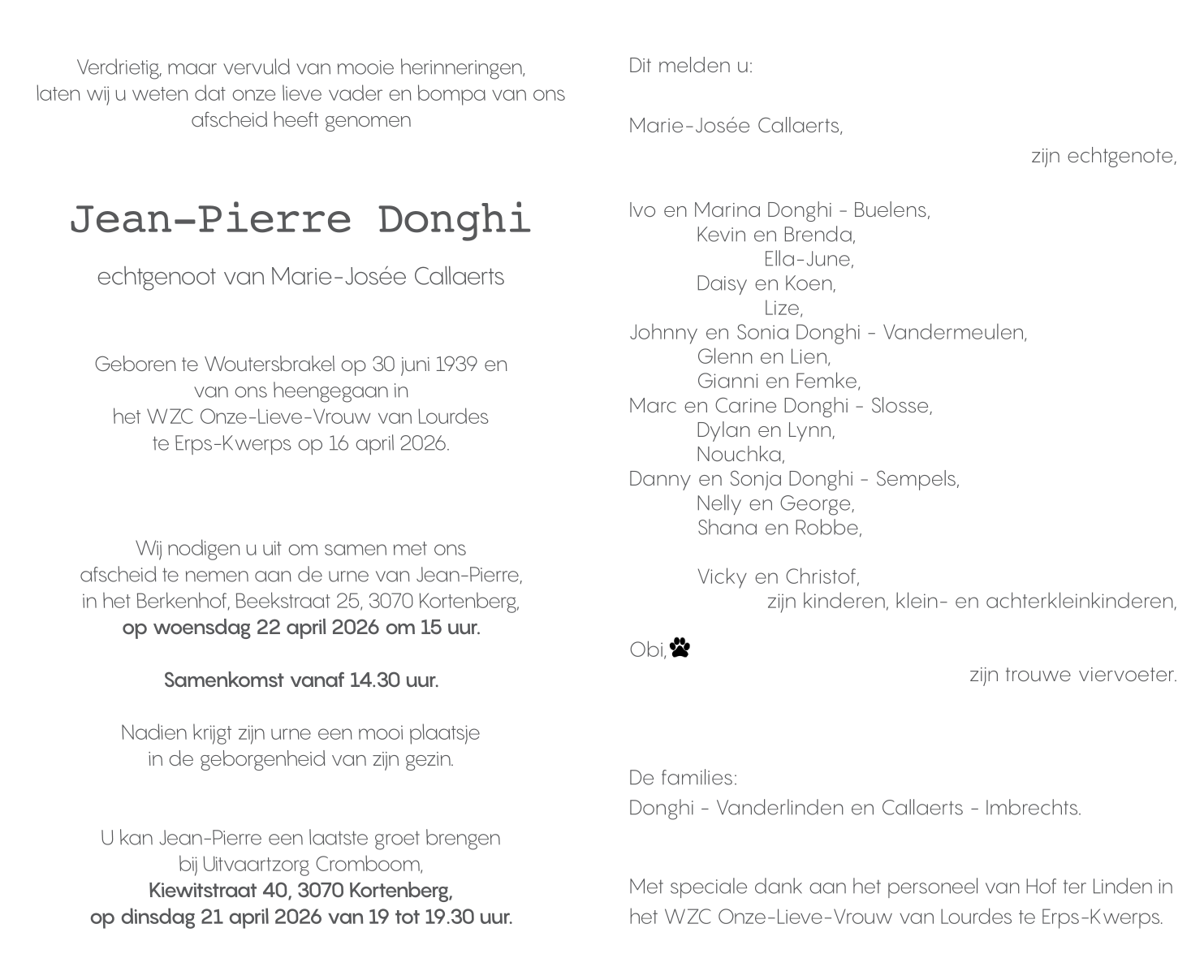 Avis de décès de De heer Jean-Pierre Donghi