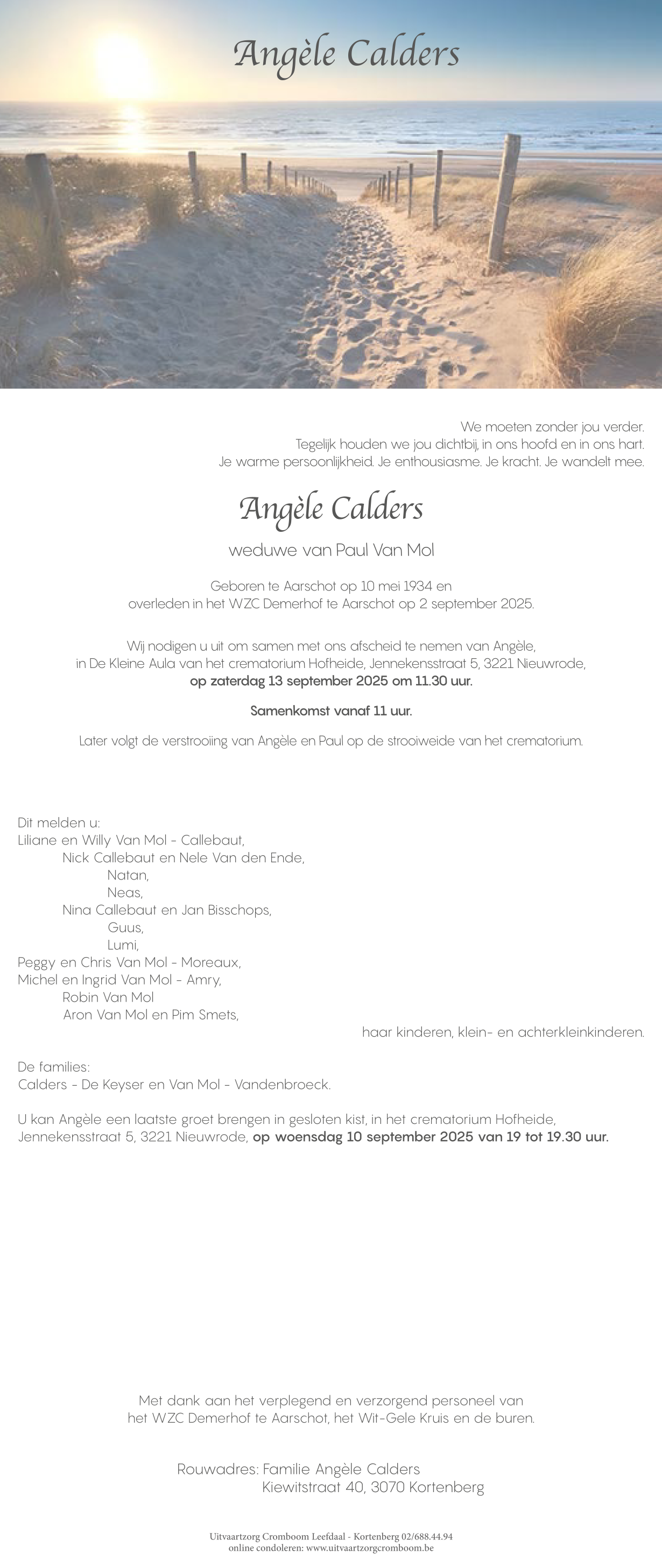Décédée à Aarschot (3200) le mardi 2 septembre 2025 à l'âge de 91 ans