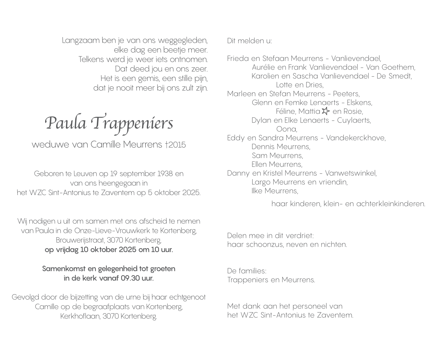 Décédée à Zaventem (1930) le dimanche 5 octobre 2025 à l'âge de 87 ans