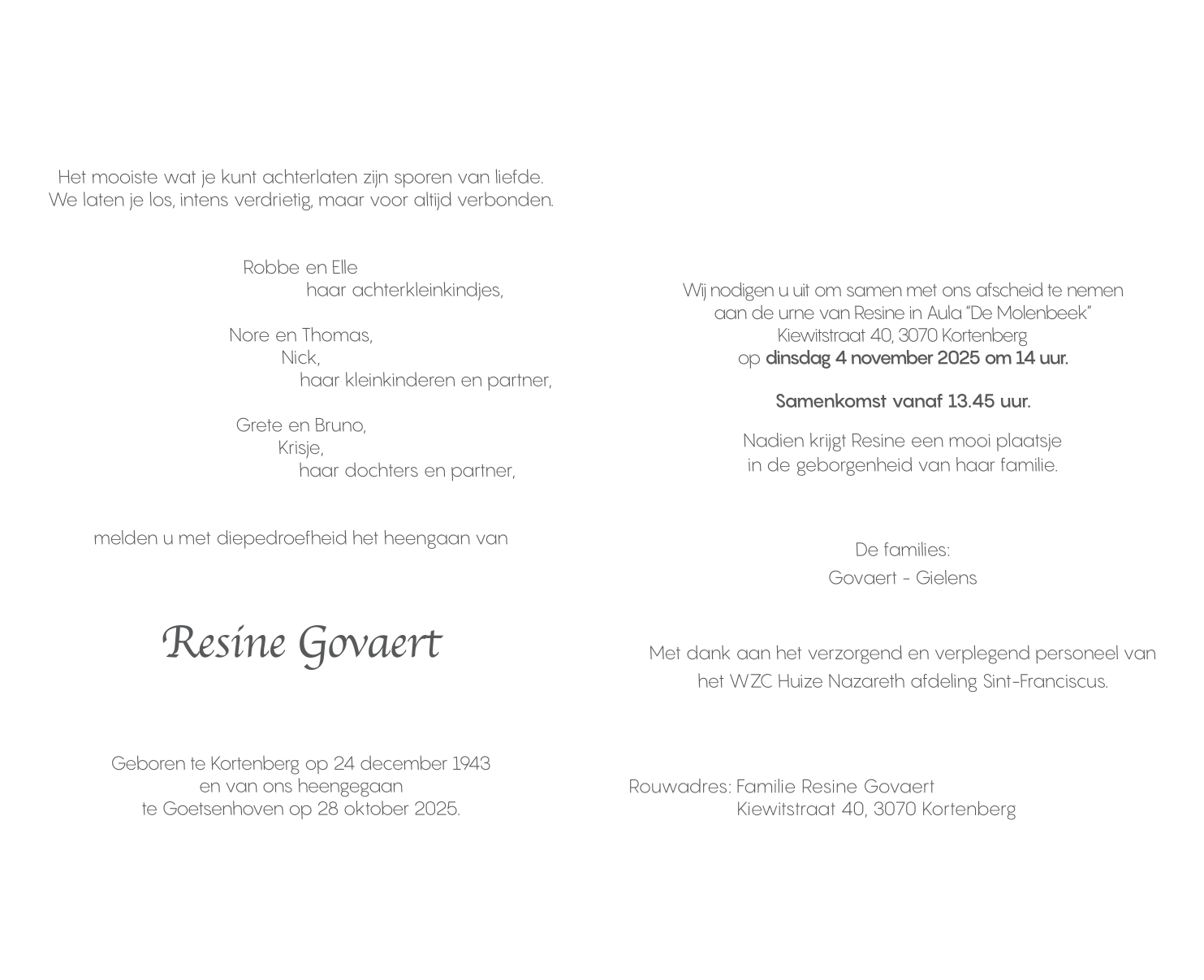 Décédée à Tienen (3300) le mardi 28 octobre 2025 à l'âge de 81 ans