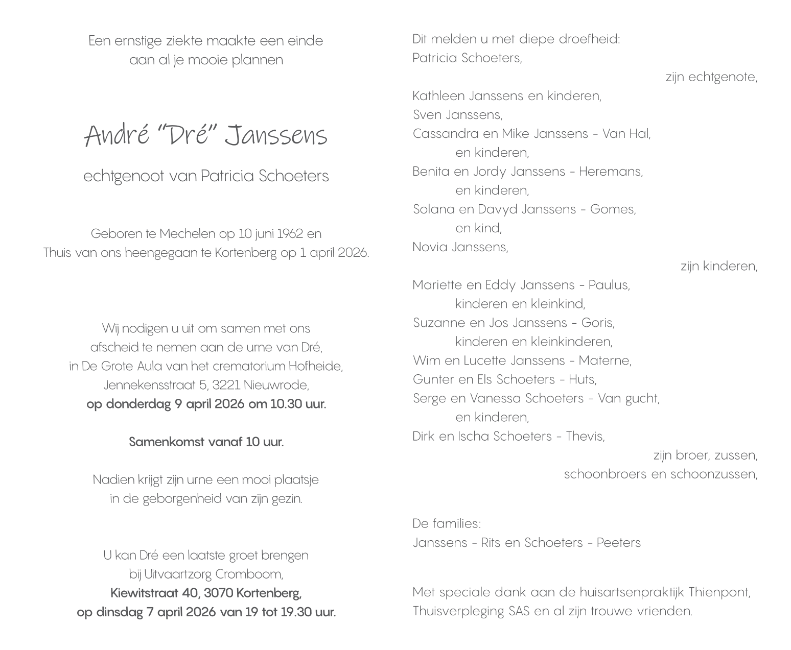 Décédé à Kortenberg (3070) le mercredi 1 avril 2026 à l'âge de 63 ans