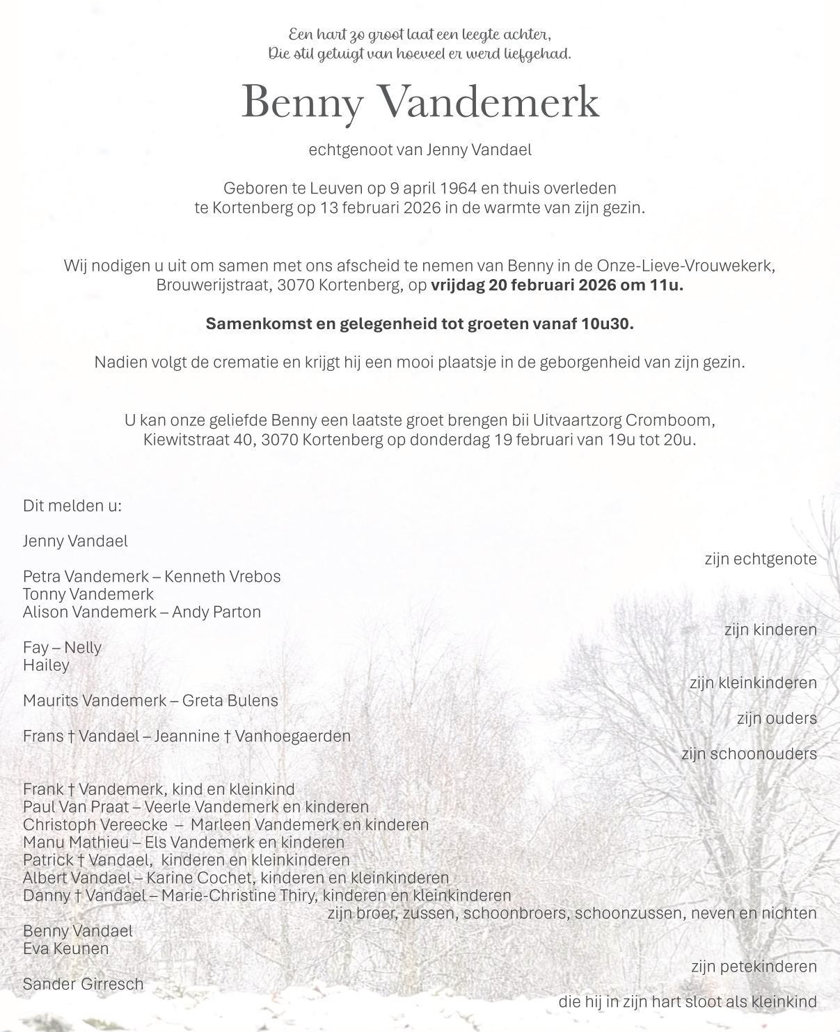 Décédé à Kortenberg (3070) le vendredi 13 février 2026 à l'âge de 61 ans