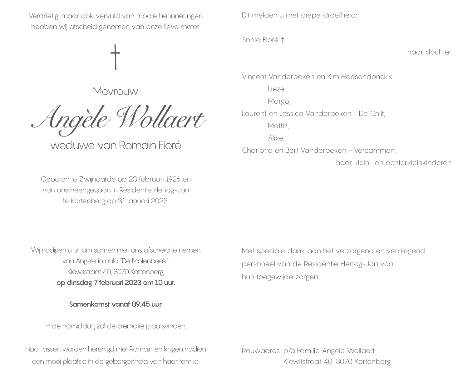 Décédée à Kortenberg (3070) le mardi 31 janvier 2023 à l'âge de 96 ans